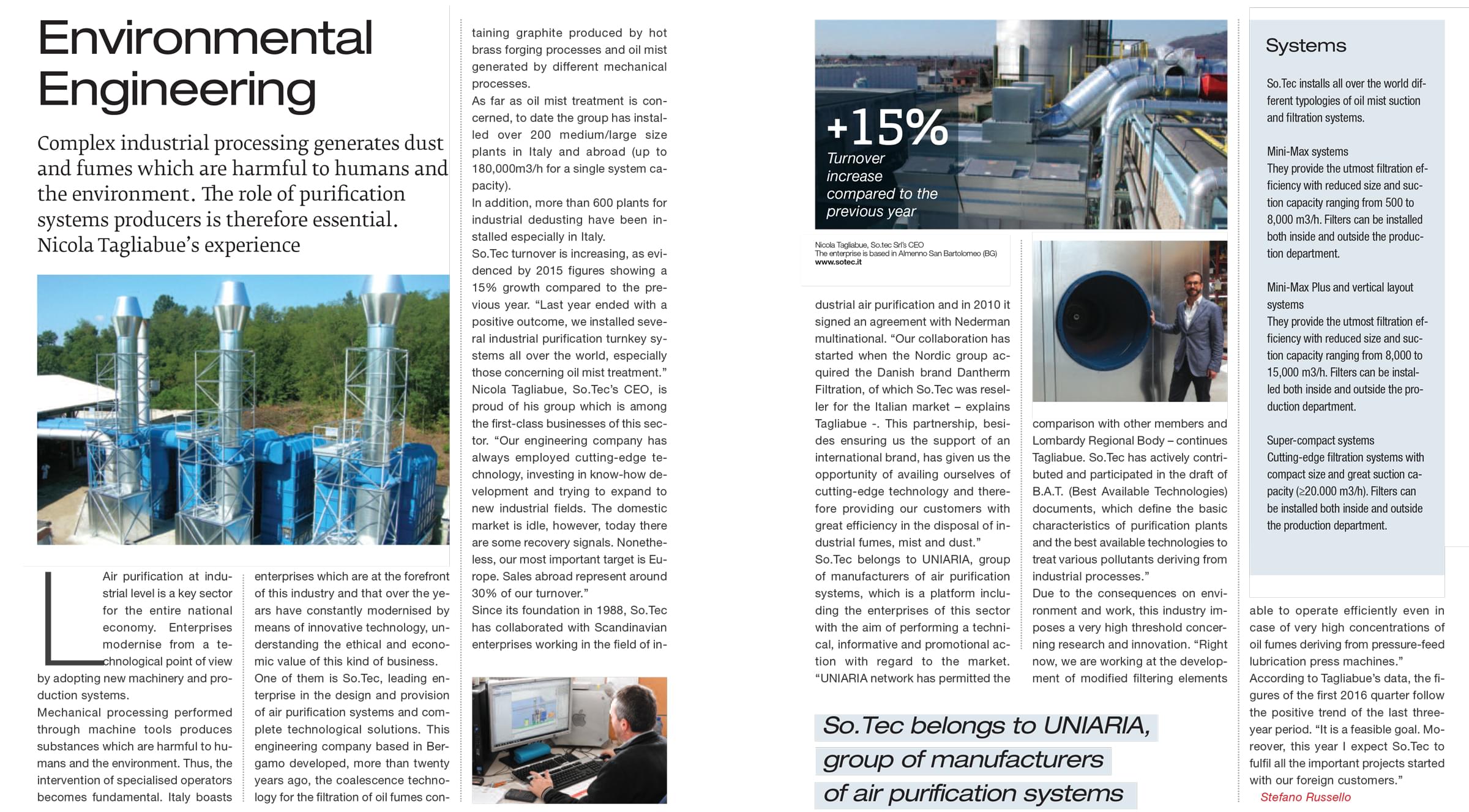 “Dicono di noi... Tags: Fumi, Depolverazione industriale, Coalescenza Autore:Nicola Tagliabue Follow me on my website Follow me on Facebook Follow me on LinkedIn Articoli Correlati Aspirazione industriale • 28/02/25 15.13 Abbattitori fumi laser CO2: scegli la tecnologia SO.TEC 5 min di lettura Fumi • 27/06/24 10.29 Impianti di aspirazione fumi da frittura industriale: massima efficienza con SO.TEC 4 min di lettura Aspirazione industriale • 29/04/24 11.51 Fumi da saldatura: l’importanza di un impianto di aspirazione efficace 4 min di lettura Fumi • 23/08/23 8.14 Aspiratori gas di scarico per officine: scegli la qualità SO.TEC 4 min di lettura